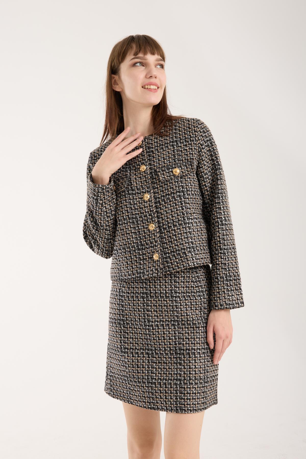 Gri Simli İthal Tüvit Kutu Ceket, kış sezonunda etkileyici bir görünüm elde etmek isteyen kadınlar için özenle tasarlanmış özel bir modeldir. İthal tüvit ceket dokusunun zarafeti, kutu formun modern çizgileriyle birleşerek her kombini anında yükseltir. Gri tonun tüm parçalara kolay uyumu ve simli detayların kattığı ışıltı, bu simli tüvit ceket modelini hem günlük kombinlerin hem de özel davetlerin vazgeçilmezi yapar. Eğer dolabında premium kalite ve zarafet arayan biriyseniz bu kadın tüvit ceket tam size göre.