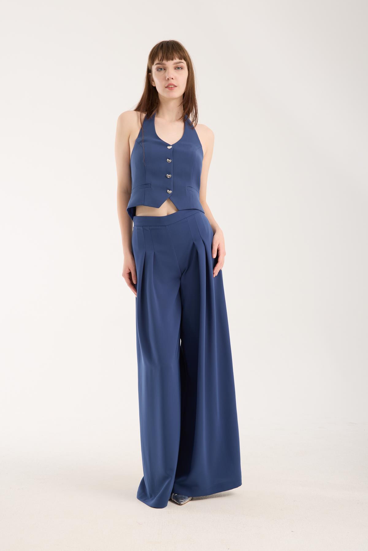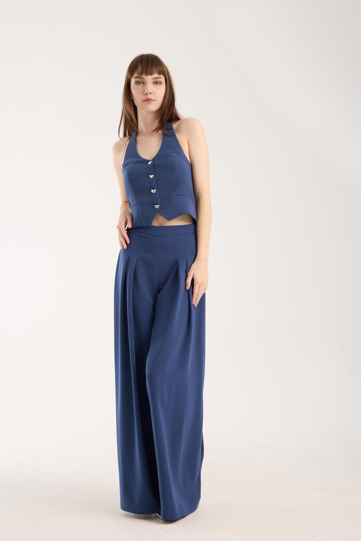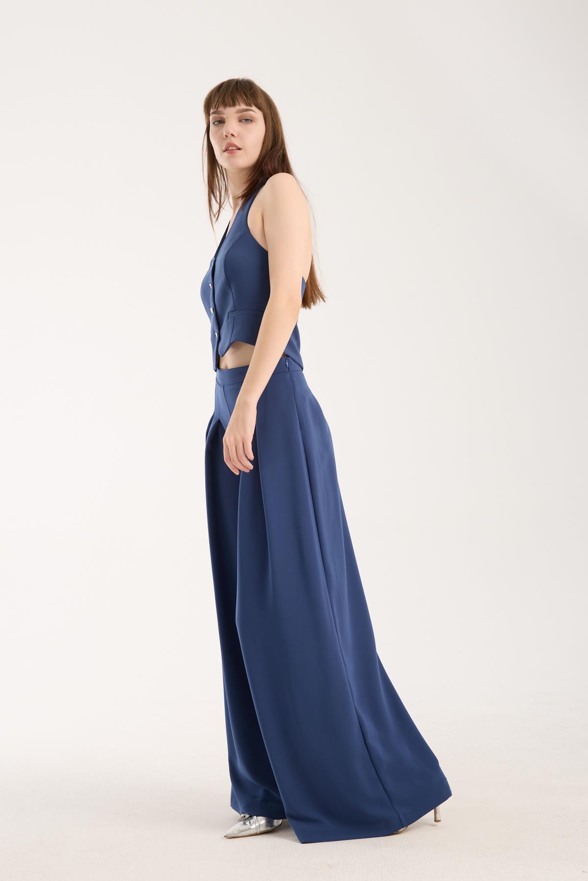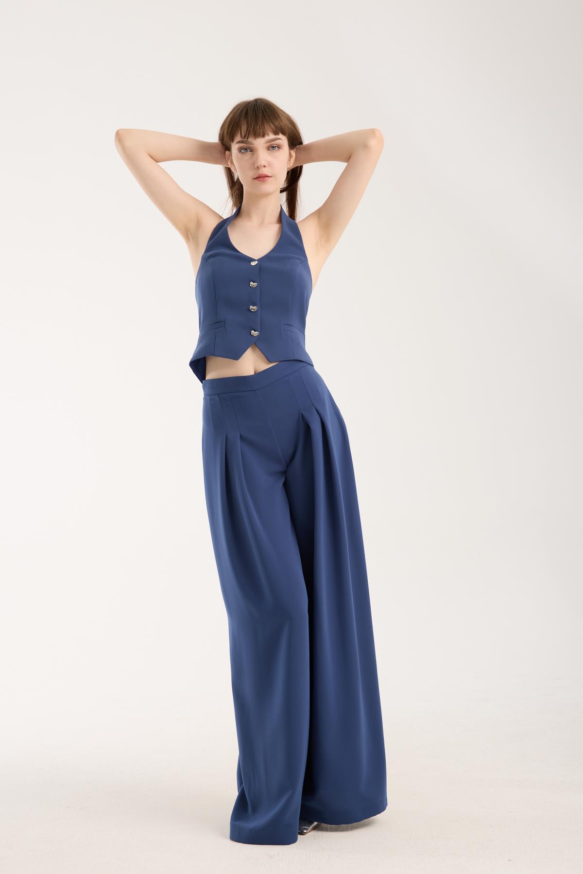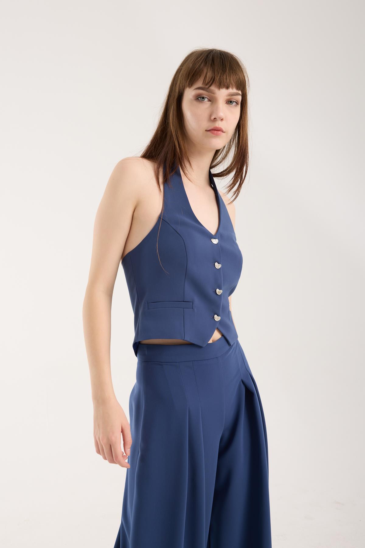 Bu indigo krep yelek, gömlek ya da basic tişört üzerine giyildiğinde ofis stiline lüks bir dokunuş katar. Dış giyimde ceket yerine kullanarak hem hafif hem modern bir katman oluşturabilirsiniz. Alt parçada kumaş pantolon veya cargo pantolon tercih ederek dengeli ve şık bir görünüm elde edebilirsiniz.