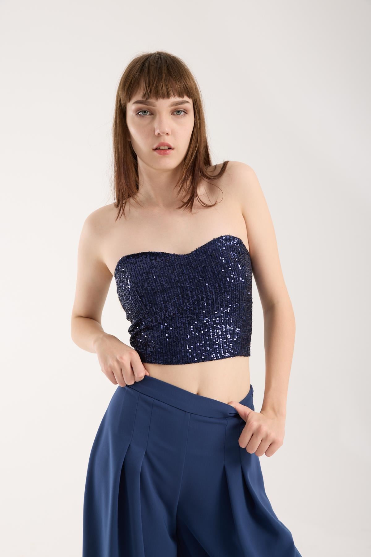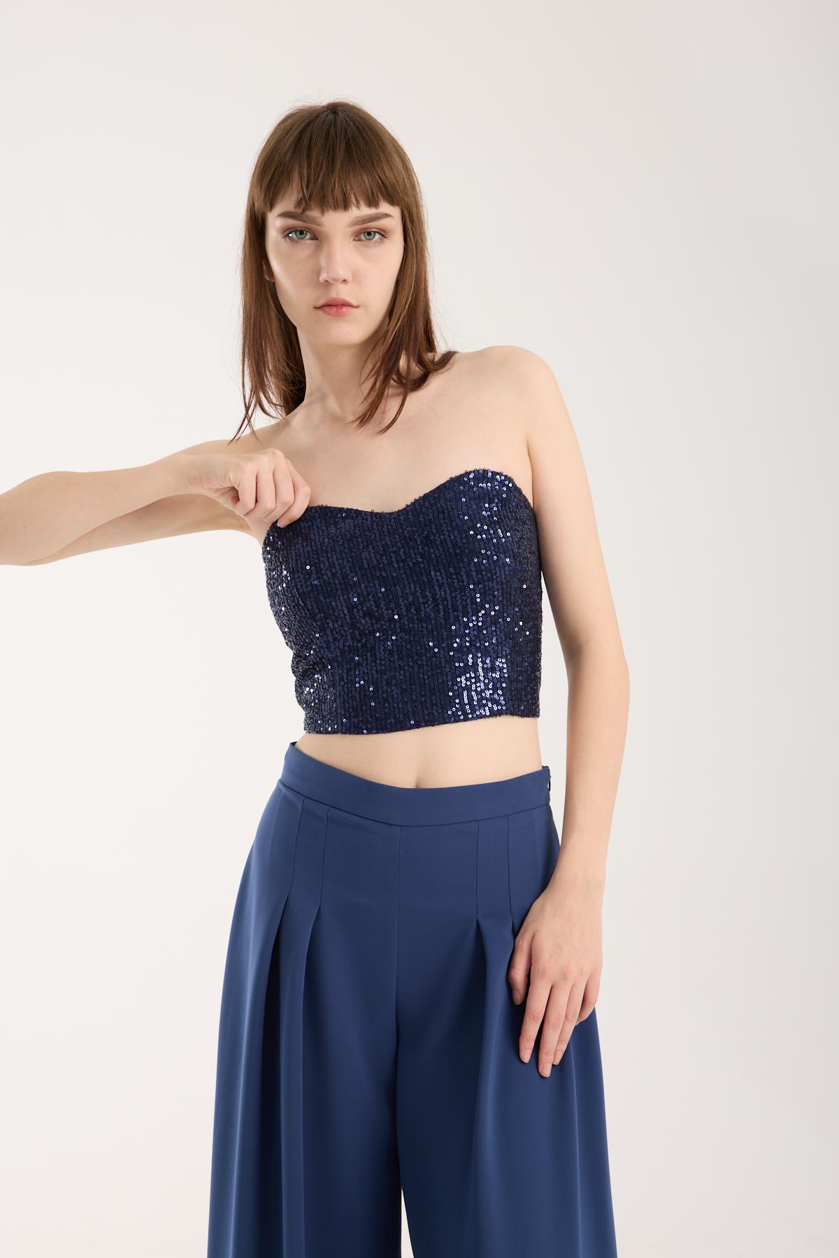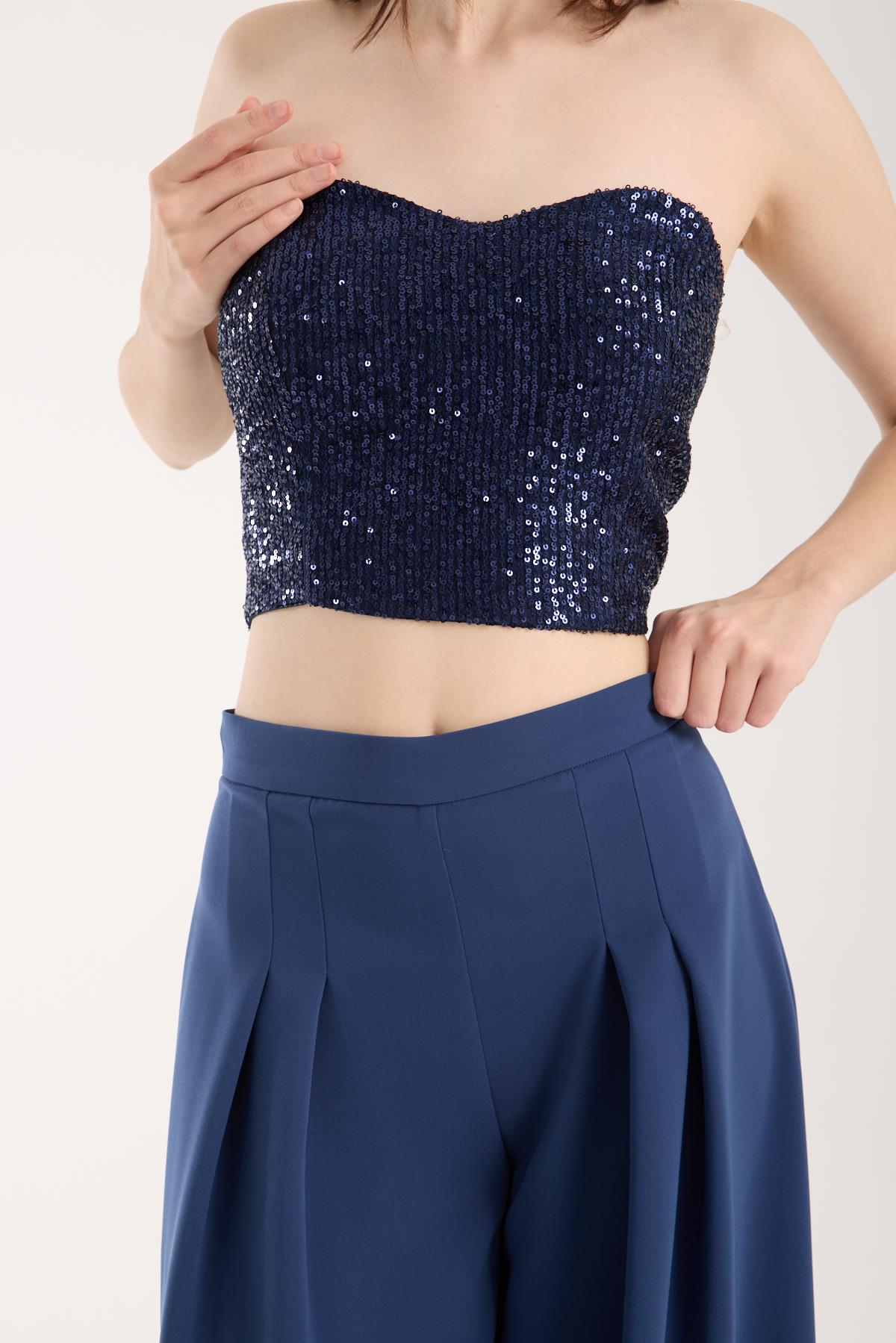 İndigo tonlarındaki bu payet crop üst, her açıdan ışığı yansıtan yüksek yoğunluklu payet dokusuyla parti ve özel davetlerde öne çıkmanı sağlar. Mat, derin mavi-mor rengi sayesinde klasik bir parça gibi dururken payetli yapısıyla dikkat çekici ve modern bir hava sunar. İç astarı sayesinde ciltle temasında konforludur ve payetlerin doğrudan cilde değmesini engeller.