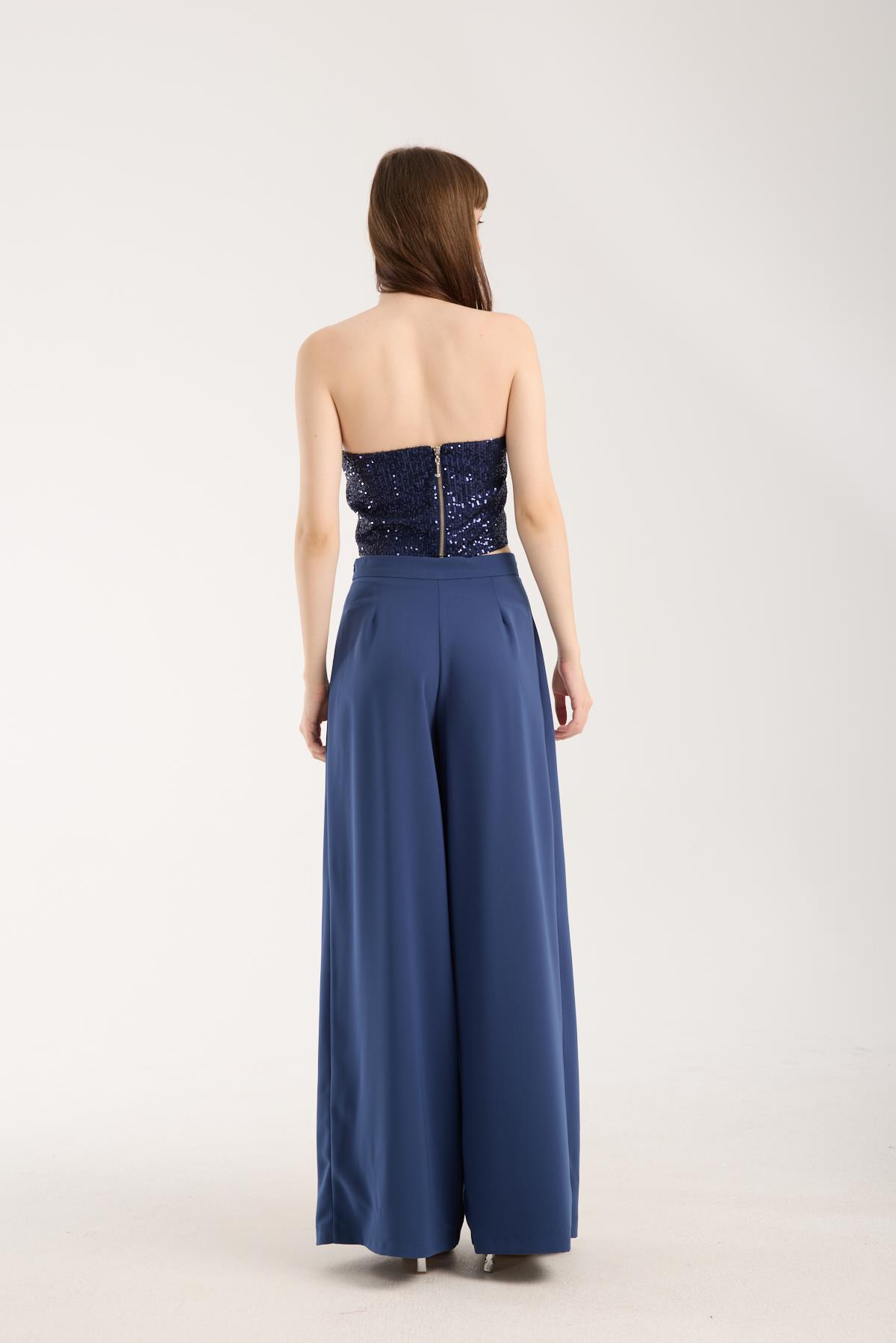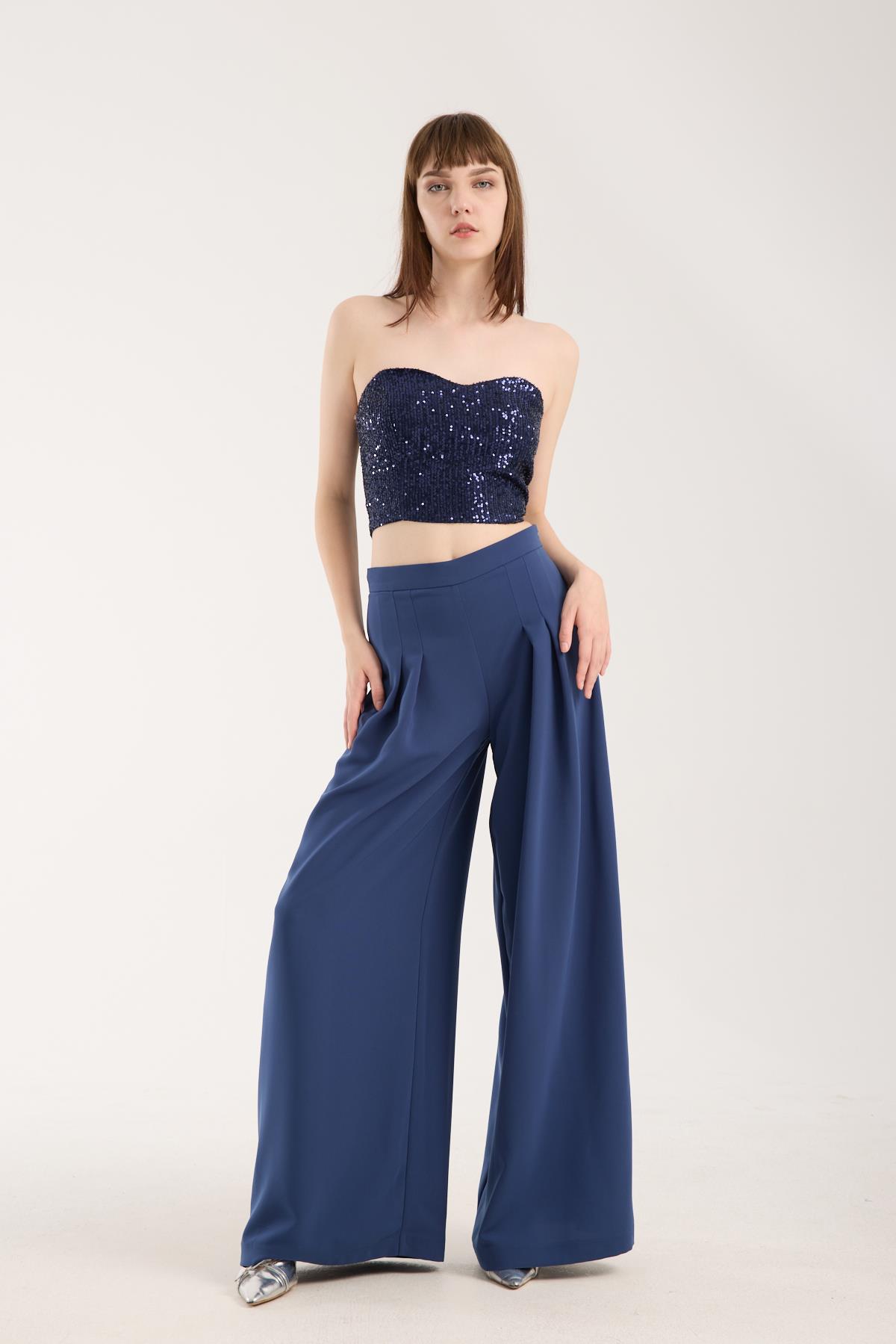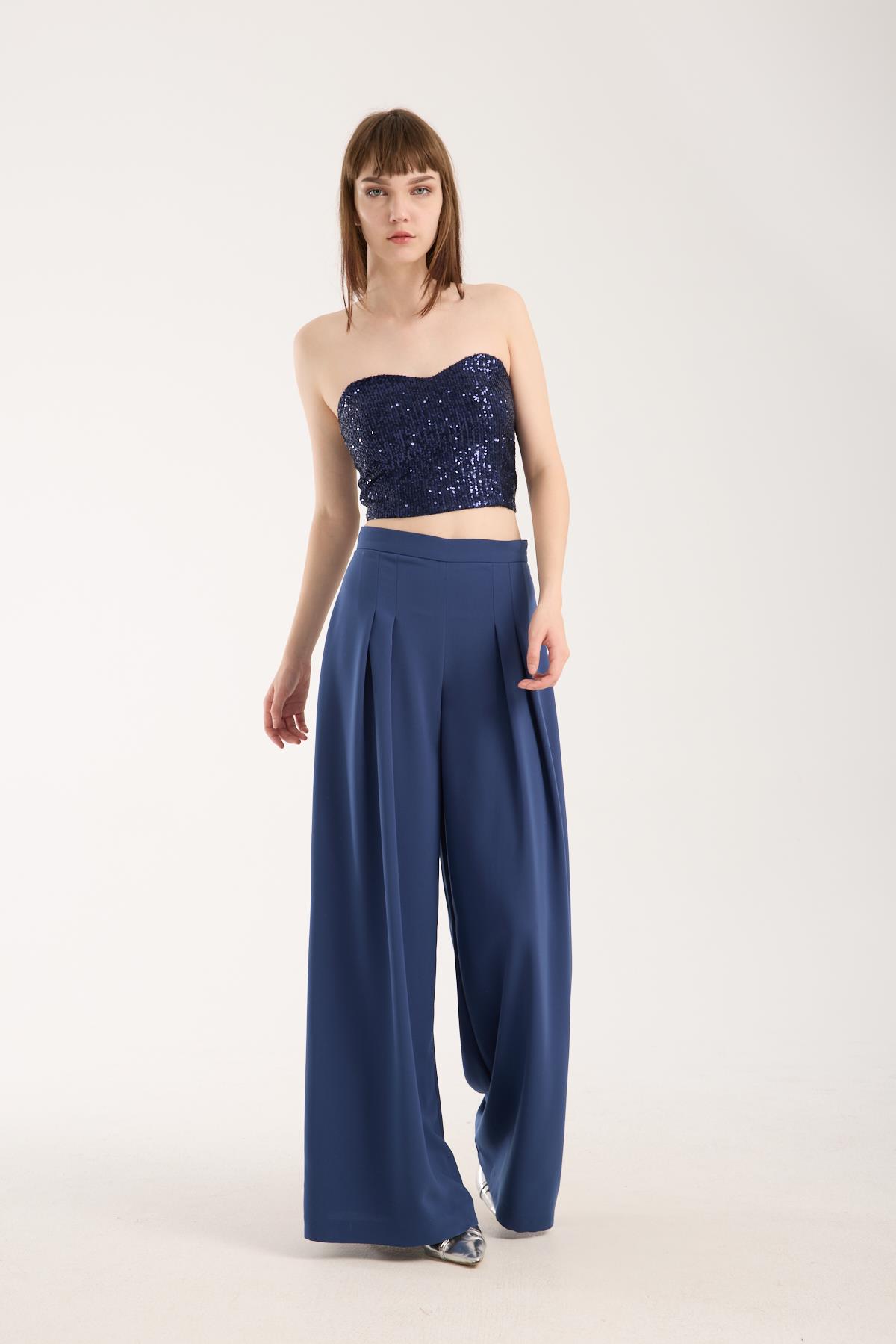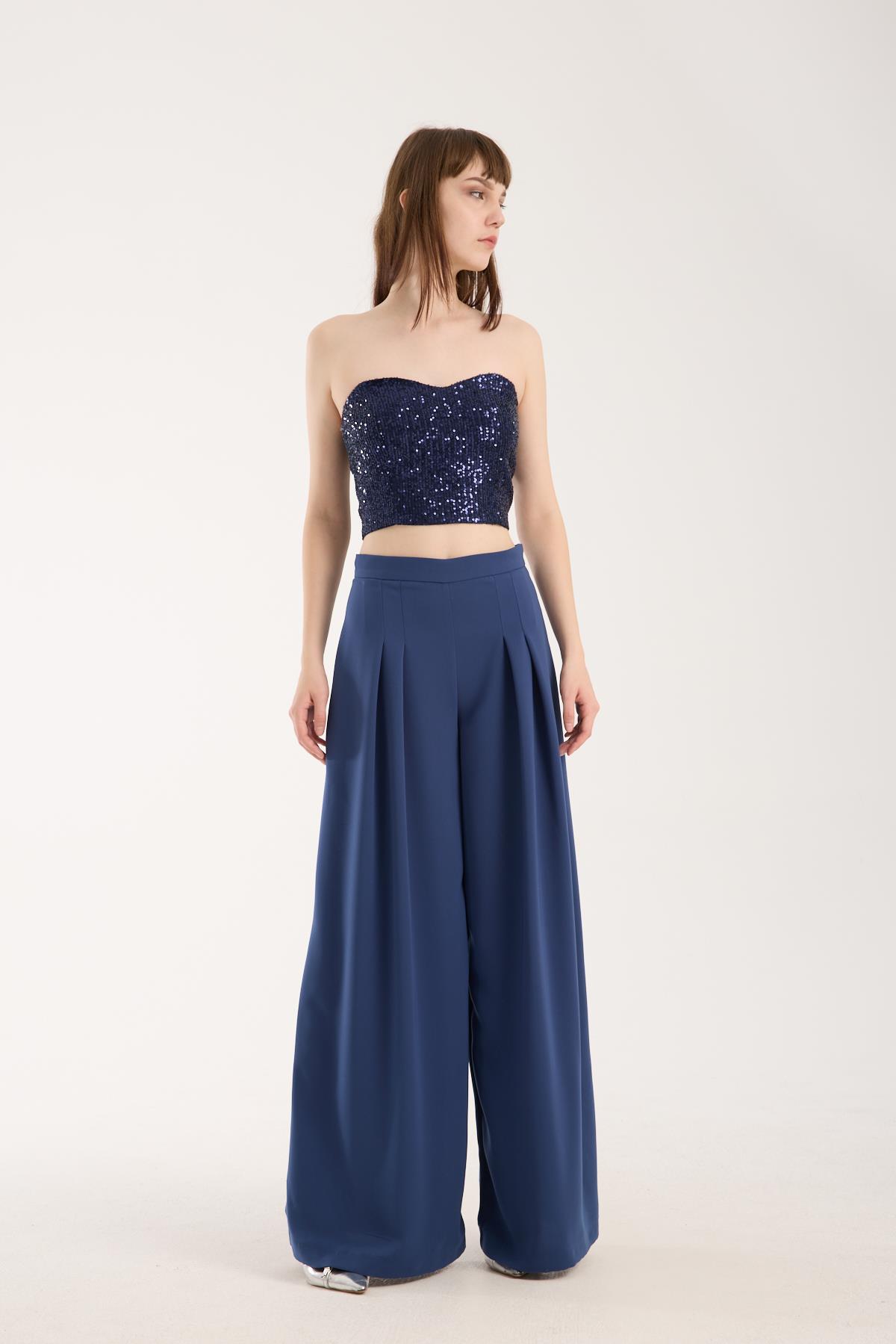 İndigo tonlarındaki bu payet crop üst, her açıdan ışığı yansıtan yüksek yoğunluklu payet dokusuyla parti ve özel davetlerde öne çıkmanı sağlar. Mat, derin mavi-mor rengi sayesinde klasik bir parça gibi dururken payetli yapısıyla dikkat çekici ve modern bir hava sunar. İç astarı sayesinde ciltle temasında konforludur ve payetlerin doğrudan cilde değmesini engeller.