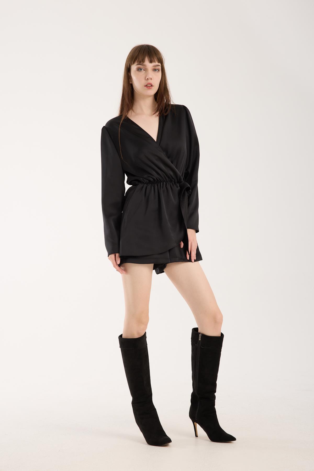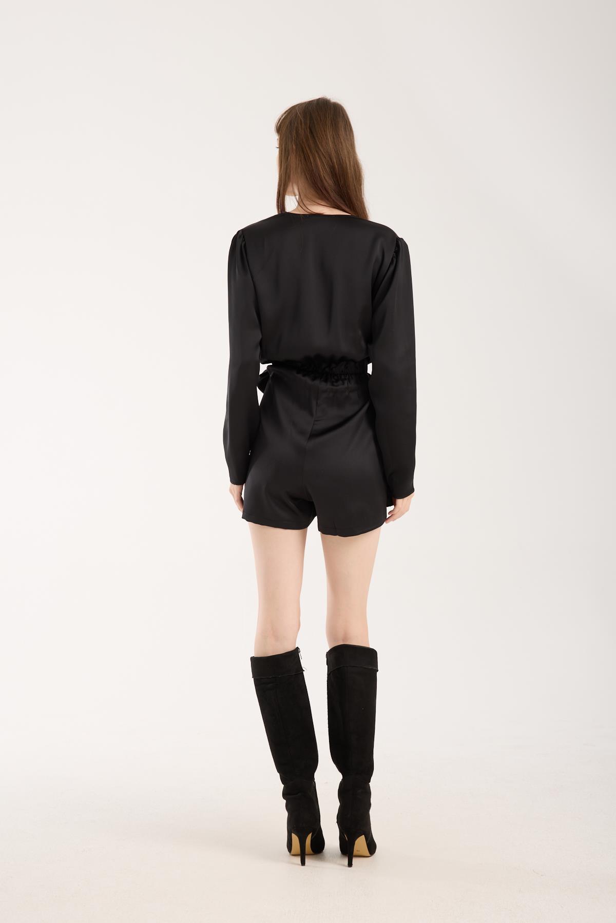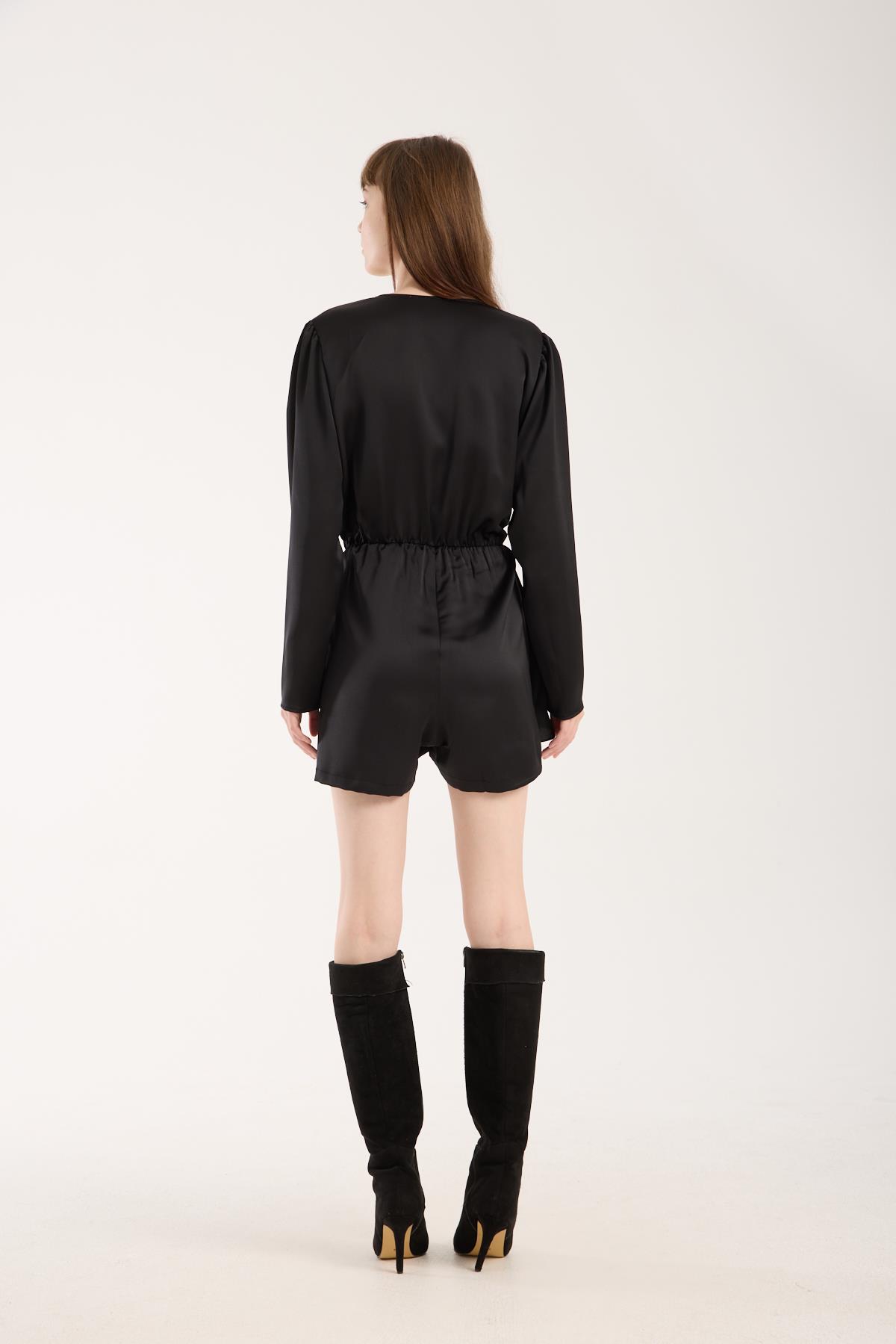 Bu şık siyah krep saten tulum, mat ve parlak yüzeylerin birleşimiyle zarif bir kontrast yaratır. Krep saten kumaş, giyside hem sofistike bir akıcılık hem de konfor sunar. Mini şort kesimi sayesinde hem hareket özgürlüğü sağlar hem de modern bir siluet sunar.