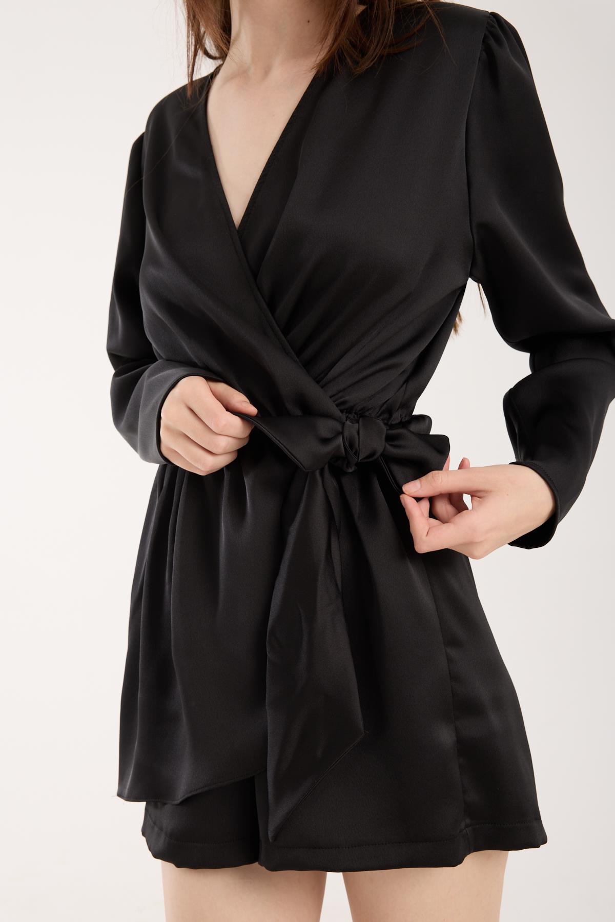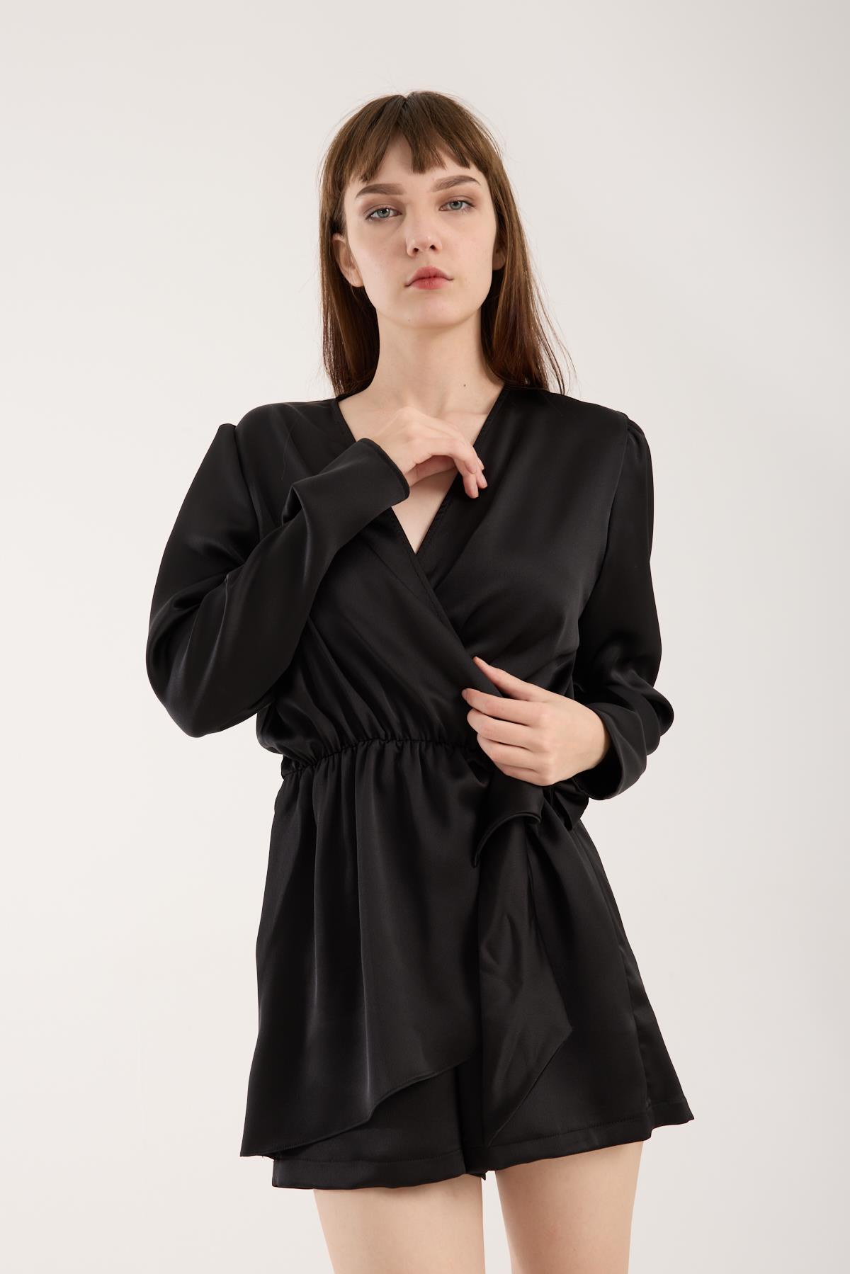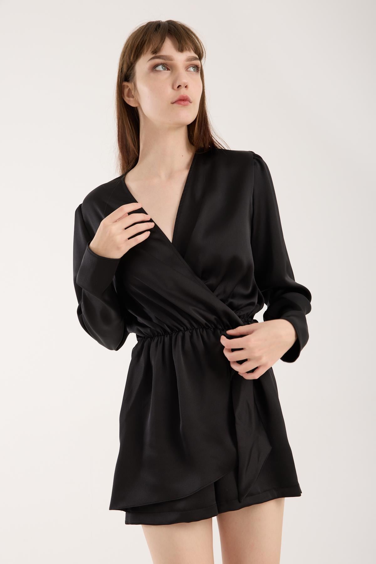 Bu şık siyah krep saten tulum, mat ve parlak yüzeylerin birleşimiyle zarif bir kontrast yaratır. Krep saten kumaş, giyside hem sofistike bir akıcılık hem de konfor sunar. Mini şort kesimi sayesinde hem hareket özgürlüğü sağlar hem de modern bir siluet sunar.